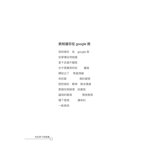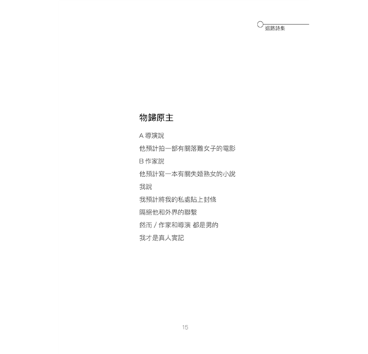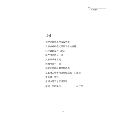 情詩總是能窺見詩人內心私密情感的視界,儘管《迴路詩集》不全然是一本情詩集,很喜愛跟著詩人對她曾經懵懂、探索的異世界起伏,在一次次的自我支解、重組與自問中,我們總能安心知道,詩人那一塊最初的原石仍保存安置在某處。像一塊徐徐發光的礦石朝曾開鑿過她的過客閃爍。 私心推薦:暗物質的淒美,水墨的古典及隨著Firry Path一路俯拾可見的音樂文字。