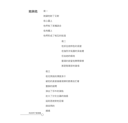 理惠的詩,可以理直氣壯說色色的事情,卻不淫穢,反而趣緻;可以毫不避諱談黑暗的情緒,餘韻卻滿是陽光;描寫可愛的貓,細思後腦袋卻像被撓了一爪。
