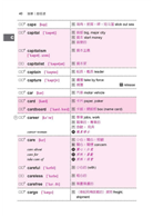 為充分使用印刷空間,並給讀者較多的相關英文單字,所以右方欄位的英文字譯與中譯及詞性就沒有辦法完全對齊;讀者若有疑慮,請參考網路字典。