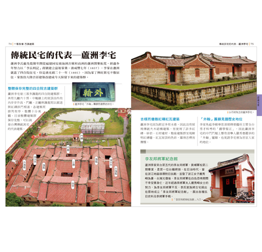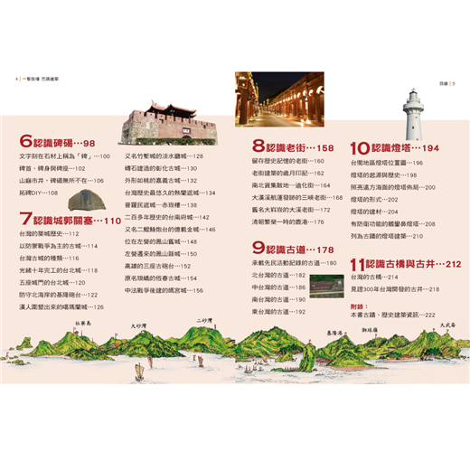 《一看就懂古蹟建築》介紹台灣各類古蹟、歷史建築:城郭、砲台、宅第、老街、寺廟、書院、碑碣、古道、燈塔、古橋、古井等,有如像一座文化資產博物館。書中利用精美的圖解形式,配合簡易的條文解說,清楚生動的呈現每個文化寶藏的精采故事,讓讀者有身歷其境的親切感,有更多的驚訝和感動。