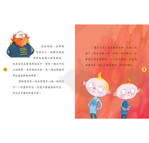 講述了大腳趾國王的將軍,霍格將軍家中整天唱反調的雙胞胎兒子,跌宕起伏的故事情節,引導孩子學會「互助互愛」,珍惜「兄弟情誼」,懂得「與家人和睦相處」,讓孩子在閱讀故事中漸漸形成良好的品格修養。