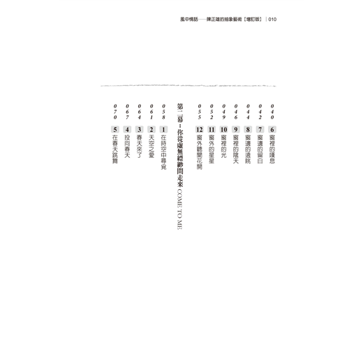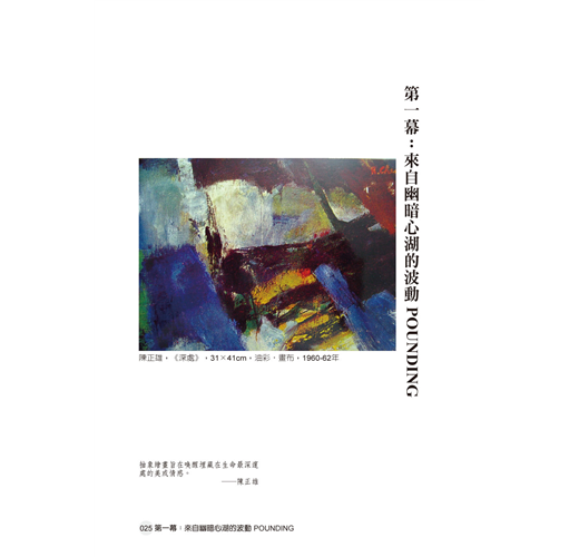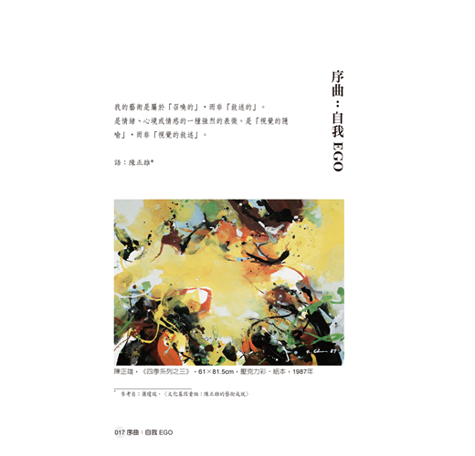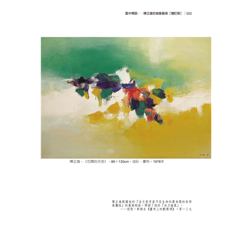 本書精選臺灣抽象藝術大師陳正雄76件代表性繪畫作品,並收錄63則風之寄的情詩與情話,期盼和觀者一齊沉醉在「詩情畫意」的活力抽象之中。