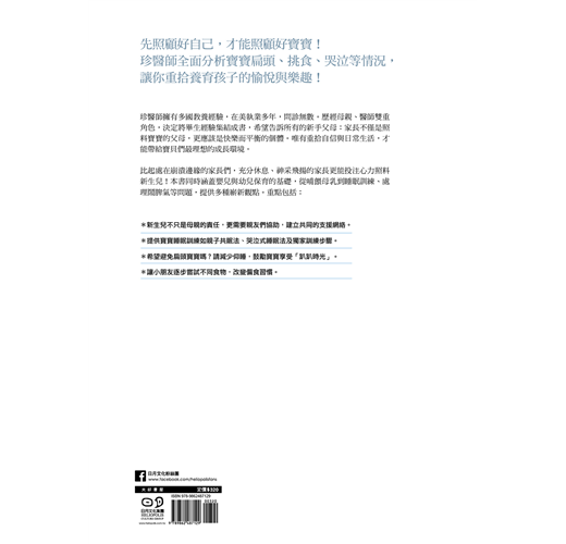 「不只教導父母如何迎接新生兒養育出健康寶寶,作者兼顧了母親的自我、家人的角色、孩子雖幼小但需要愛撫的心靈。用心但不必艱苦,費神但仍保持輕鬆,讓父母雖然承擔責任,而仍享有自由。這是一本非常難得的現代專業育兒書。」──李佳燕/家庭醫師