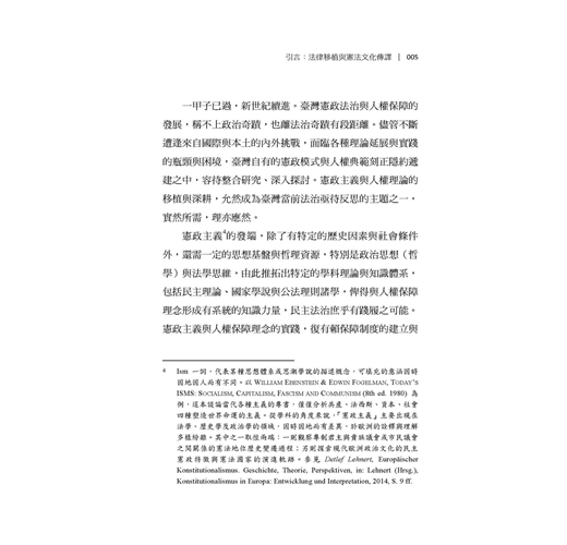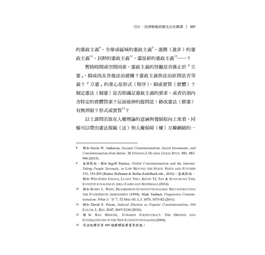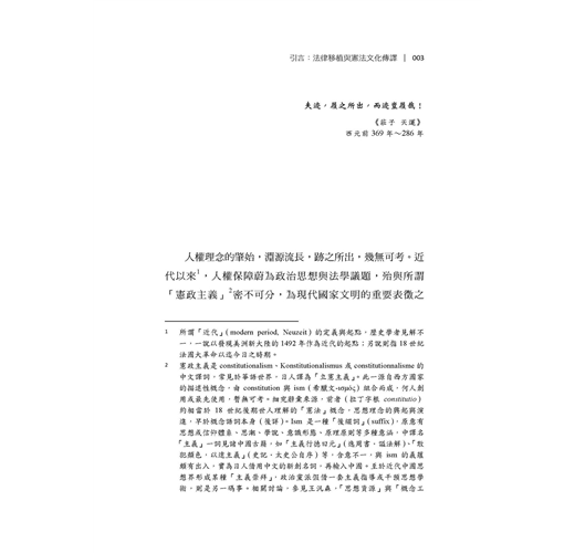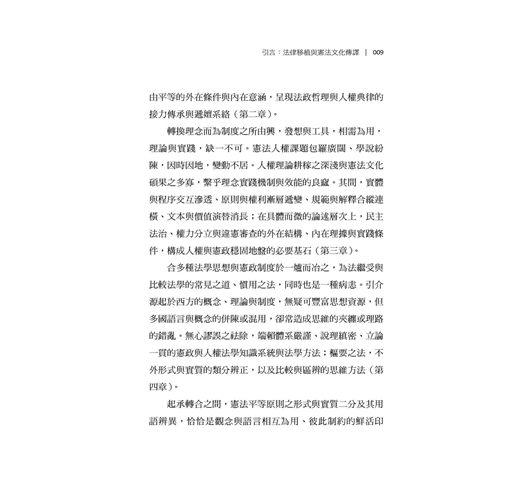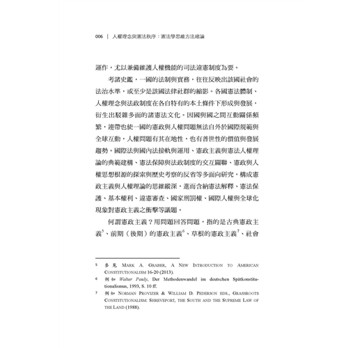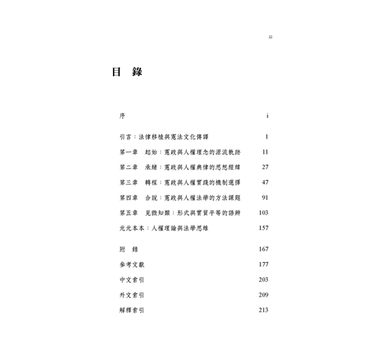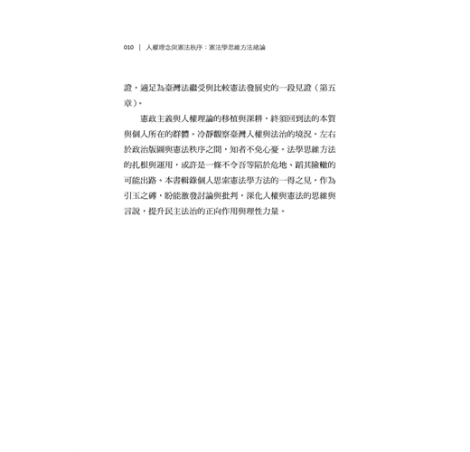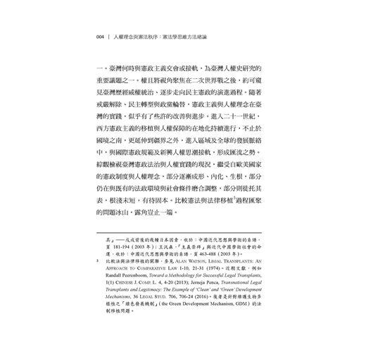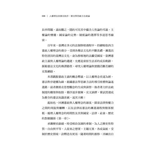 臺灣憲政制度與人權理念繼受自泰西東洋諸國,部分逐漸成形內化,部分則持續磨合調適。在法律移植過程中,人權理念史、憲政制度與法學方法的關聯論題,始終是臺灣公法社群的共通課題與普遍困境,尤以欠缺具歷史縱深底蘊與條理思維方法為最。本書嘗試從憲政主義歷史源流與憲法學方法論的視角,對人權理念進行原理推演,建構憲法秩序的思維體系,期使基本權蘊含秩序理念、論證紋裡,成為貼近現實、可資適用的客觀法規範,而非只是某種政治、道德或價值的決斷。