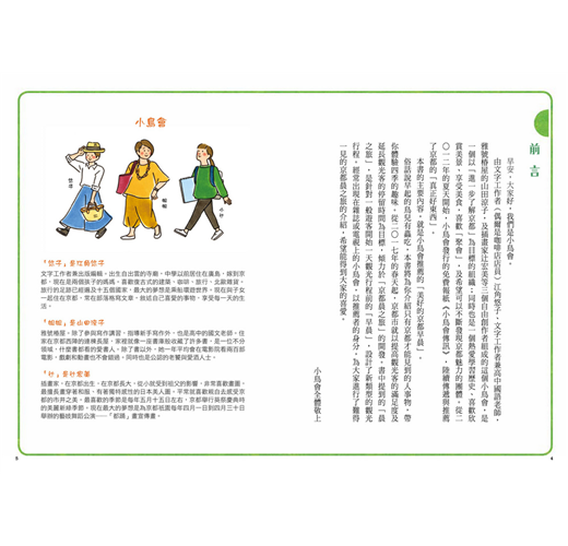 書中許多令人興味昂然的店家和活動都是自詡為「京都通」的我所不知道的,在看這本書的同時也默默把書中的景點、店家給記了下來,下次一定要「按書索驥」,跟著小鳥會的腳步,來趟從晨間開始的「京都再發現」之旅。──卡瓦納/旅遊部落客、作家