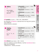 字根:包含「人、人體器官」、「心理感覺」、「行為動作」、「性質狀態」、「實務器具」、「顏色溫度」、「方位」、「動植物與自然界」八大主題。