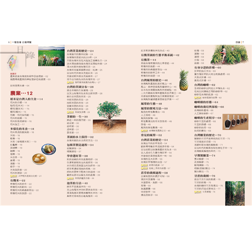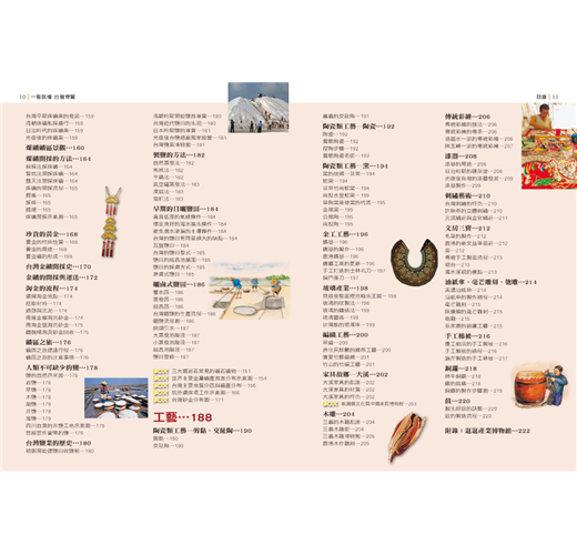 本書中,以多樣豐富的圖文闡述了台灣傳統農業的特色,並演義了有機農業的遠景;以精細的插畫圖解帶領讀者回顧台灣三寶—茶葉、砂糖、樟腦的歷史地位及產業結構;以珍貴圖片引導讀者進入時光隧道,親臨台灣漁業、礦業充滿汗水及豐收喜悅的現場;以傳統工藝家展示的精采作品,見證台灣多元文化的璀璨成就。