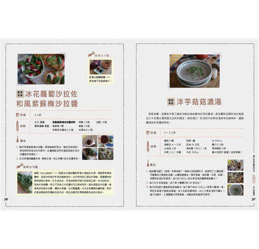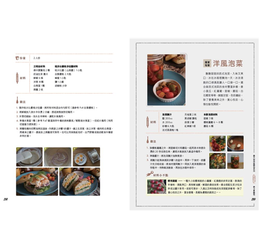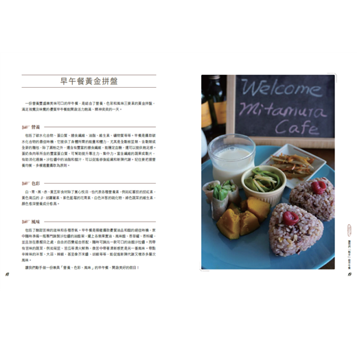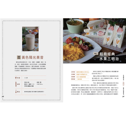 學會這幾個基本麵包款式後,要創造出豐富的早餐就必須學會更多的配菜與組合,例如各式抹醬的製作、油漬小番茄的做法、各種蛋沙拉的做法,以及各種搭配湯品和飲料的做法,讓早餐不再是一成不變。書中也特別將準備早午餐時會遇到的問題整理成篇章,如「輕鬆做水煮蛋」、「快速燙青菜法」、「麵包回溫法」、「免沾手淺漬」等等,讓早午餐的內容更豐富美味,準備更加快速方便。書後的「美味關係」篇,能幫助你精進早午餐功力,如起司、拿鐵、濃湯、清湯、沙拉、醬類、雞蛋、香草與麵包的各種運用和搭配方法,讓早午餐料理更加隨心所欲,創造百種自己喜歡的組合。