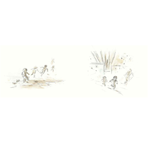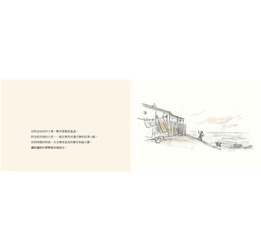 本書來自作者杜柏的母親,童年的親身經歷。杜柏用鉛筆創作速寫風格的圖畫,以「一頁文字+多張連續插圖」的方式,帶領孩子體會阿金的遭遇。她成熟的繪畫技巧,真實傳遞出阿金的害怕、無助、孤單、想家。而黑、灰、米黃等近乎無色彩的色調,更是流露出難民無家可歸的迷惘心情。