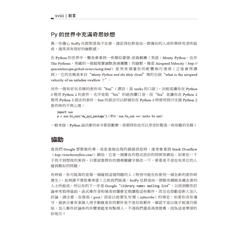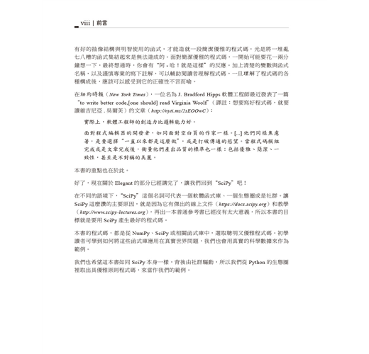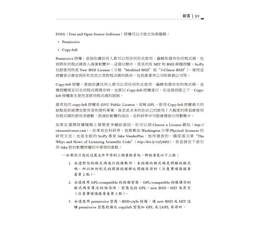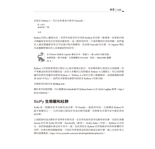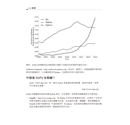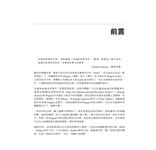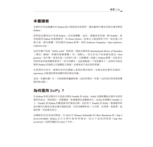 歡迎來到科研界Python社群,如果你是一個寫Python的科學研究者,這本實用的指引書,不只教你SciPy和相關函式庫的重要基礎,而且能讓你看到美麗、易讀,同時能應用在實務上程式碼。你會學到如何寫出具備清楚、簡潔和高效的優雅程式碼。