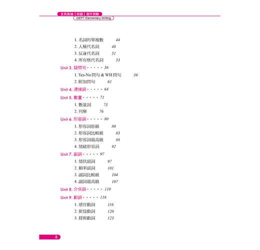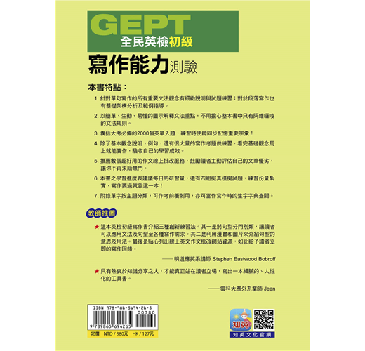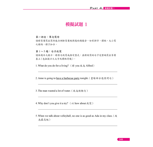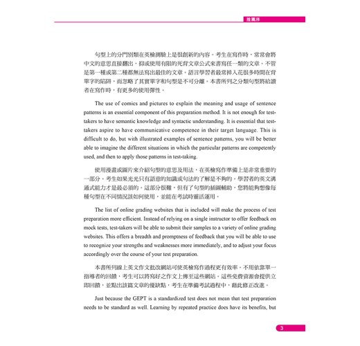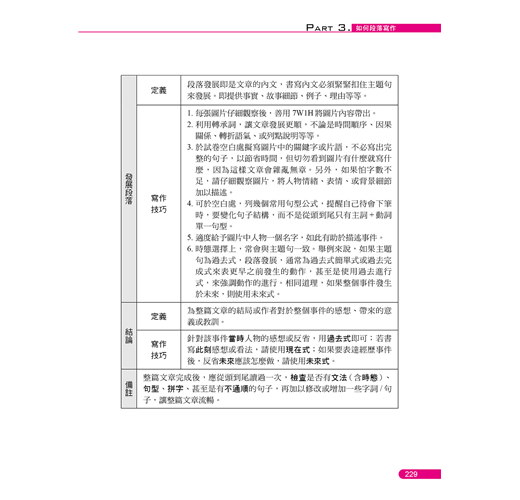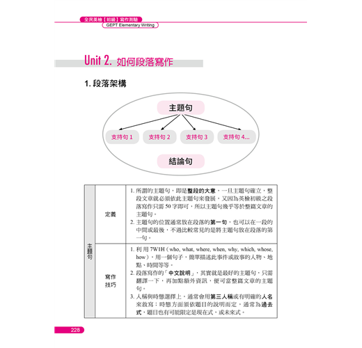 1. 針對單句寫作的所有重要文法觀念有細緻說明與試題練習;對於段落寫作也有基礎架構分析及範例指導。