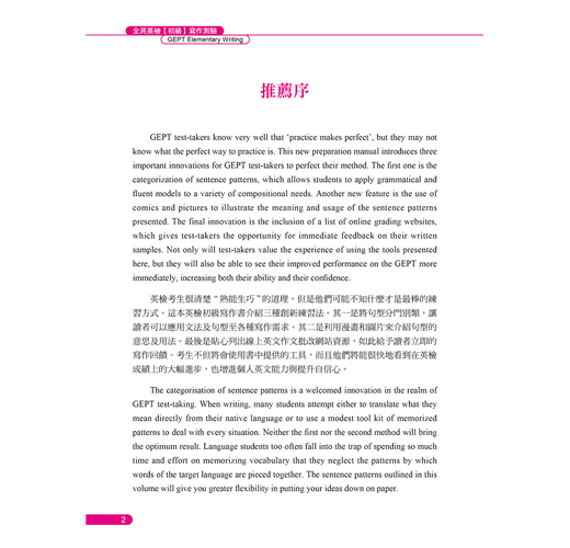 這本英檢初級寫作書介紹三種創新練習法。其一是將句型分門別類,讓讀者可以應用文法及句型至各種寫作需求。其二是利用漫畫和圖片來介紹句型的意思及用法。最後是貼心列出線上英文作文批改網站資源,如此給予讀者立即的寫作回饋。