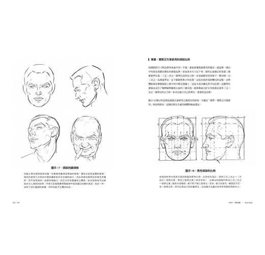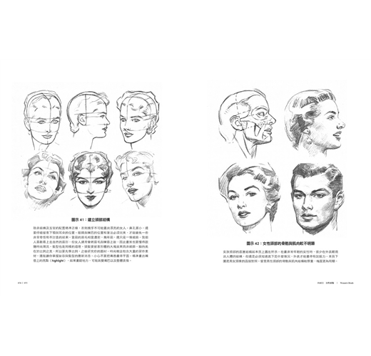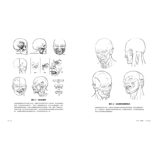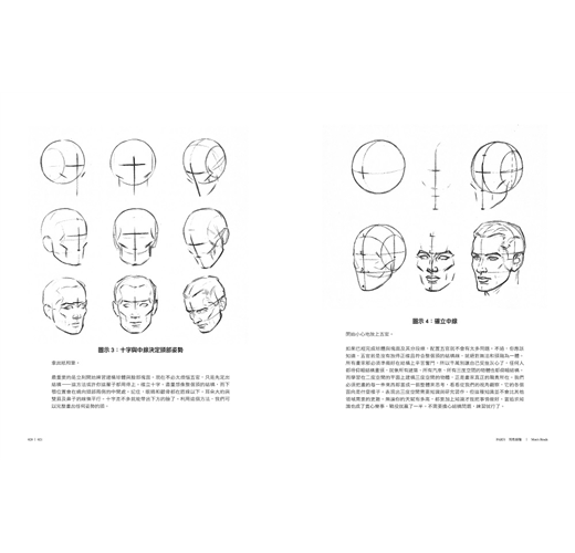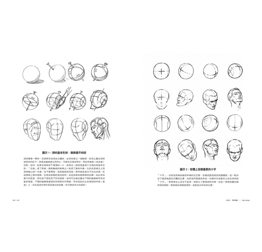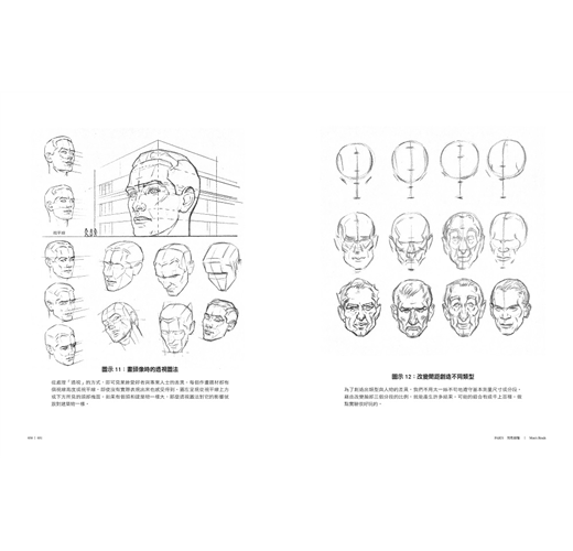 頭的基本形狀:兩側扁平的球/球體上至關重要的十字/十字與中線決定頭部姿勢/確立中線/簡化的骨骼結構/結構內的骨骼部件/頭在頸部之上的動作/由片段建立頭部/頭部的基本塊面與次級塊面/傾斜的頭部/畫頭像時的透視圖法/改變間距創造不同類型/一定要以中線為基礎/創作任何想要的類型/藉由變化球體與塊面以建立不同類型/展現人物特色/頭部的韻律線/男性頭部的比例/依單位畫頭/頭部的解剖圖/肌肉的運作/從各種角度觀察肌肉/嘴巴的機械作用/眼睛的機械作用/嘴唇的動作/鼻子與耳朵的結構/大笑/各種表情/透過表情塑造人物/分析臉部標記/不同年齡的臉/塑造塊面/結合人體解剖構造、結構,與塊面/用塊面建立色調/每個頭都是獨特個案/人物類型/微笑的男子/年長的男性/人物塑造
