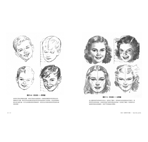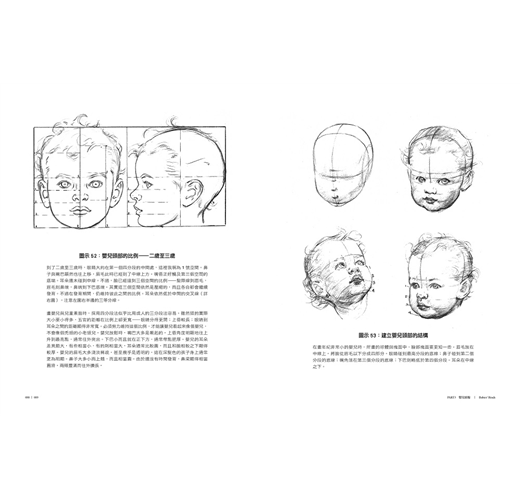 嬰兒頭部的比例——一歲/嬰兒頭部的比例——二歲至三歲/建立嬰兒頭部的結構/嬰兒速寫/嬰兒習作一/嬰兒習作二/嬰兒習作三/臉的四個分段——三歲至四歲