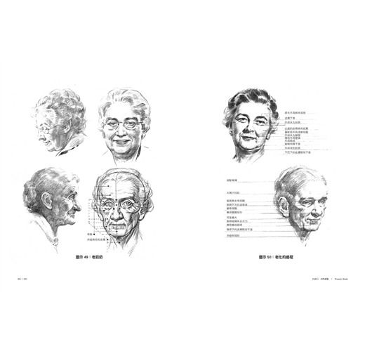 建構女性頭部/建立頭部結構/女性頭部的骨骼與肌肉較不明顯/魅力存於基本素描/「塊狀」也適用於女性頭像/女性頭像一/女性頭像二/速寫一/速寫二/老奶奶/老化的過程