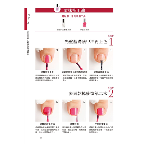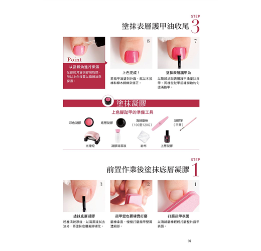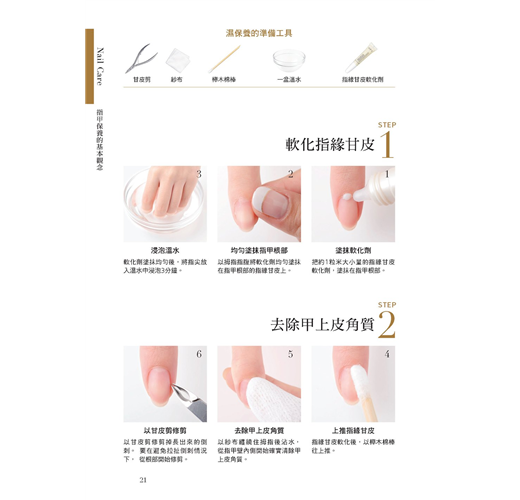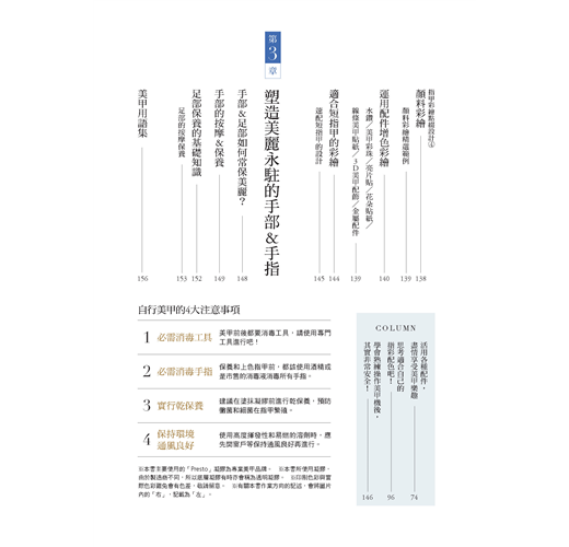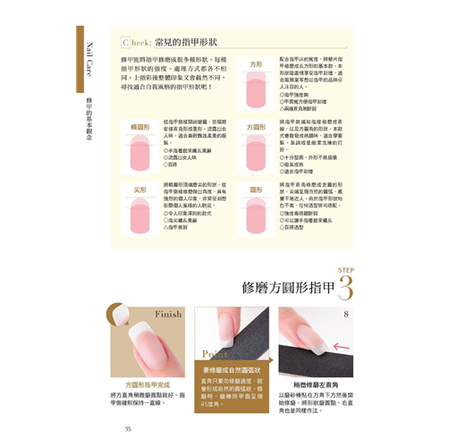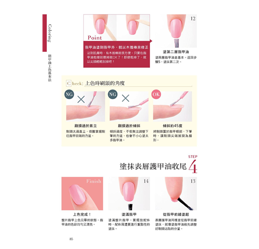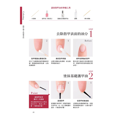 全書收錄簡單易懂的指甲保養&彩繪基礎,指甲疑難雜症的解決之道、美甲小重點,手部保養、修甲、養甲、卸甲、彩繪、裝飾、足部保養....等都詳盡介紹,可說是一本涵蓋的多本美甲筆記書精華的「美甲教科書」!