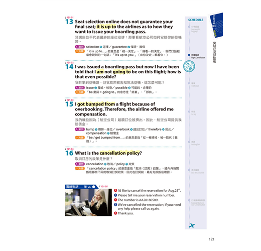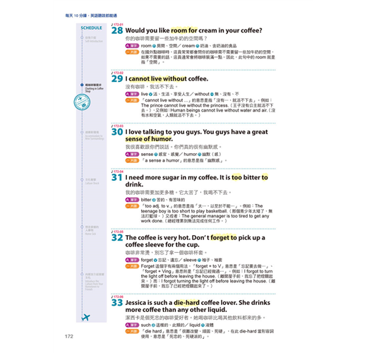 會話的延伸學習也很重要,每句會話句都補充重點單字、文法或片語,不只讓你學會句型,也能深入學習句中的重點單字並活用片語,也可以透過替換句中的重點單字,自行練習、創造更多屬於你的英語會話句!