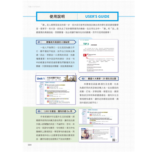 2. 隨時說─想像自己已置身國外,任何句子都先用英語思考,再試著說出來,若有機會請找朋友一起練習,靈活運用所學內容。也可以將自己說的句子錄下來,再對照CD音檔中專業美籍老師的發音及語調,看看還有哪些需要調整的地方。