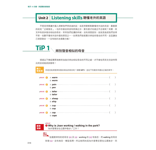 2. 持續聽─本書特別採用一句一軌的分軌方式,方便讀者重複聽。平時可以將CD音檔抓進手機或隨身裝置,利用零碎的時間聽,為耳朵創造全英語環境。即使一次只有聽3-5分鐘,長久累積下來便會發現英語已經存在你的聽覺,上場交談時完全不用擔心!
