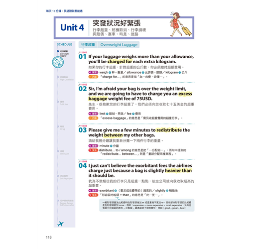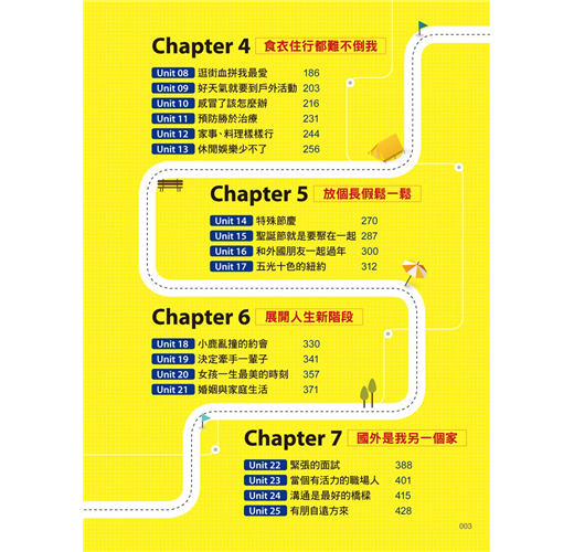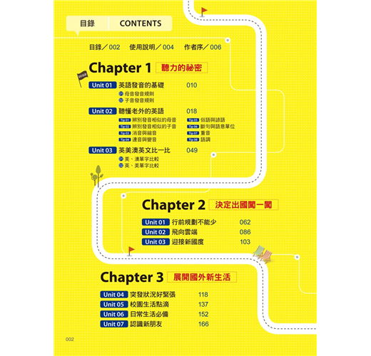 本書會話分6大章節、25個生活主題,化身你最好用的英語會話懶人包。從「出國前的規劃」、「打包」、「求學就職」、「戀愛交友」、「應對緊急狀況」和「特殊節慶通通包」,國內外生活情境應有盡有,讓你走到哪就說到哪,遇到什麼狀況都不怕!