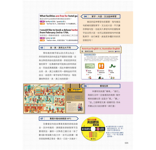 • 本書附贈CD片收錄英語會話句、英、美、澳三國單字及實境對話