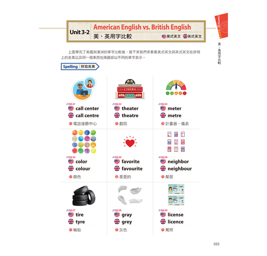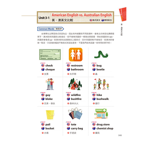 學校教的幾乎都以美式用法為主,然而使用英語的地區並不僅限於美國,若無法熟悉其他地區的腔調,即使是原來就會的單字,在溝通時都可能無法即時辨認出,而造成溝通困難。因此本書特別整理出英、美、澳三地關於同一個物品的不同說法、或是同一單字卻不同拼法,幫助讀者熟悉英、美、澳三地不同的用字及腔調。