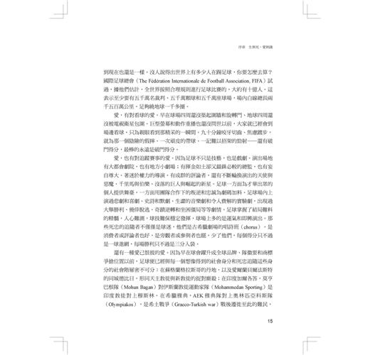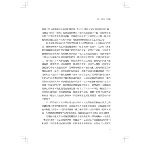 足球是最全球化的文化活動,影響力跨越種族、性別、宗教、時區……,透過踢球、觀戰、組織團體和追蹤賽事等行動,人群界定了彼此的分際,建立了自我的認同。因此沒有哪一段歷史可以不談足球,也沒有哪一個足球活動從當代社會中抽離了以後,還能描述其發展過程及意義。
