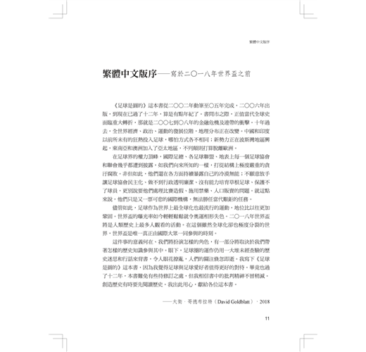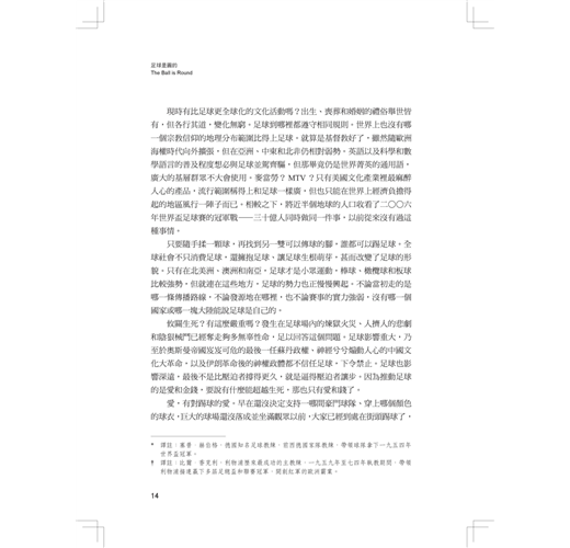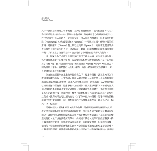 足球和歷史、運動和政治、競賽和金錢,這些明顯無不緊密相關,然而,歷史學者和運動刊物卻想把兩者區隔開來。歷史學者這麼做是為了劃清因果關係,運動刊物這麼做則是基於道德。也許歷史學者是對的。足球並未改變歷史運行。足球沒有激發工業革命,促使城市興起。足球不曾掀起戰爭、終止戰爭或代替戰爭,也無從促成世界和平,重劃國家邊界。但在如今這樣一個時代,全球的連結前所未有的緊密,全世界最普遍的文化現象卻是足球,這難道不特別嗎?當城市勞動階級的男性手頭有了一點時間和閒錢,幾乎每個地方的人都選擇把餘裕用來踢足球、看足球、籌組足球隊和追蹤足球比賽,這難道不值得一提嗎?欲重述當代歷史,卻對此現象隻字不提,豈能稱得上明智?不管歷史學者喜不喜歡,足球都不能從現代世界歷史中去除;雖然沒有規律且難以捉摸,但無可否認,現代世界歷史就銘刻在足球史之內。