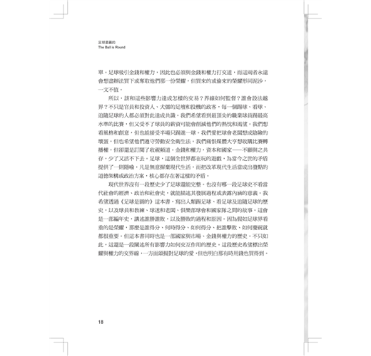 「足球早已不單是一項運動,更是全球通行的語言。這本《足球是圓的》帶我們回顧足球的歷史,以及歷史上足球運動發展的重要階段和社會脈絡。這本書讓足球迷們不只欣賞球場上的球技...