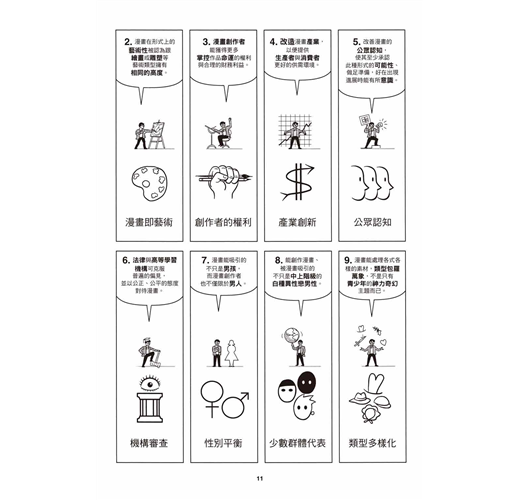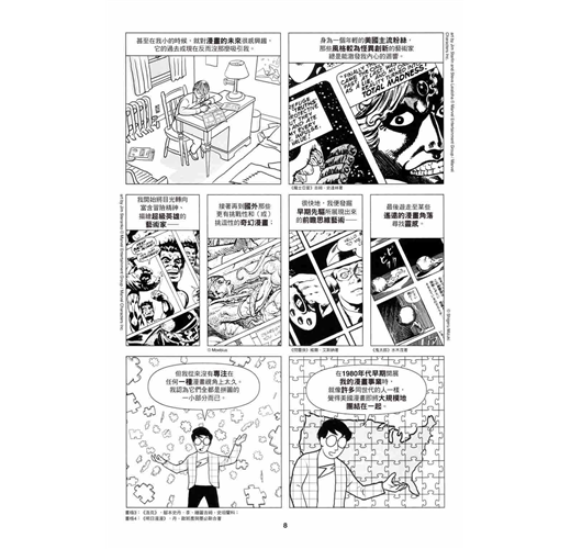 以簡明易瞭的方式,爬梳出漫畫作為藝術創作,其發展與流變是如何多元,並緊貼我們所生存的人類社會。再次驗證漫畫的力量的強大、深遠,是真正超乎普羅大眾之想像。