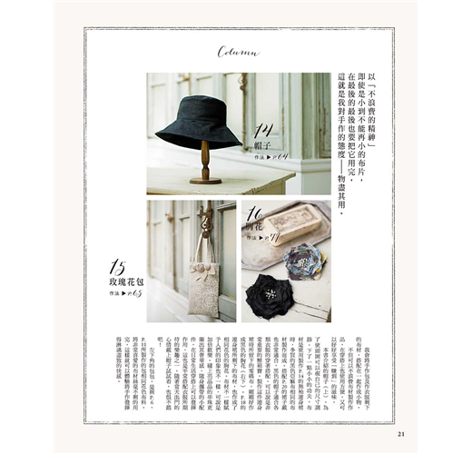 本書收錄28款こうの早苗老師用心過生活,認真創作的裁縫日常,除了拼布包製作,簡單優雅的手作服也是拼布人最愛的品項!秉持著以日常生活中身邊既有的物品當成素材,創造出可愛的作品為信念,早苗老師的每一件作品都擁有自己獨一無二的個性及創意,即使是以零碼布料拼接而成,也因為創意的美感展現而被賦予了新的生命。她喜歡無所不用其極的將一塊布用到最後一分,這樣的精神,讓她得到更多製作靈感,也因為不同素材的組合,而迸發出更多有趣的搭配及全新的時尚想法,將手作落實在生活中,而生活也是手作的繆思女神,喜愛裁縫的您,一定能夠從本書得到更多職人的創作理念,啟發您的手作魂!