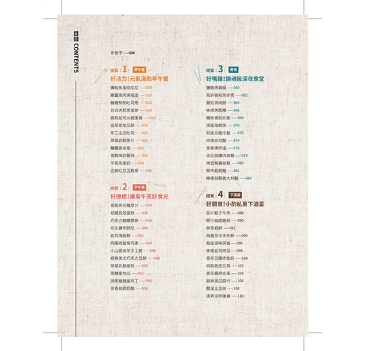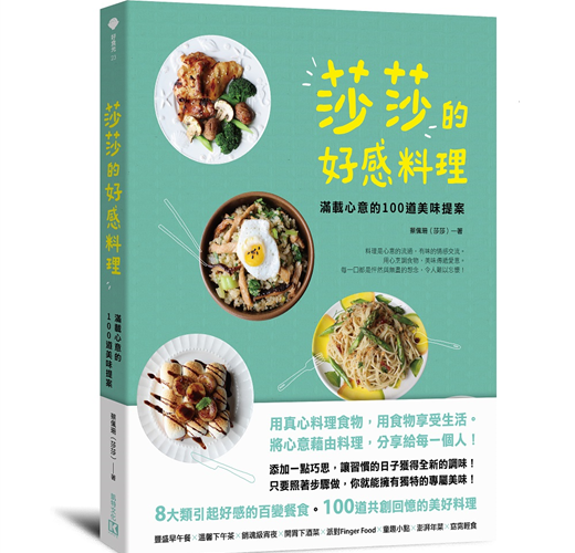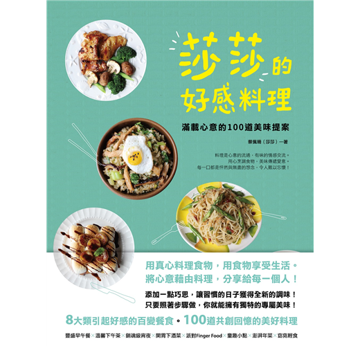 這次莎莎便以「Party」為靈感發想出100道菜餚,將生活中常見的食材,變化成8大類各具特色的美食,包括活力早午餐、溫馨下午茶、派對Finger Food、童趣點心、銷魂宵夜、窈窕輕食、開胃下酒菜到澎湃年菜等各式佳餚。雖然沒有昂貴頂級的食材、精細繁複的步驟,僅有一顆真心、一雙暖手及貼近生活的酸甜苦辣,仍能藉由這些美味將大家團聚在一起,一口一口,用不一樣的調味,說著同一個故事,將平凡的每一天都變得特別。秉持「用真心料理食物,用食物享受生活」的初衷,將心意藉由料理,分享給每一個人。