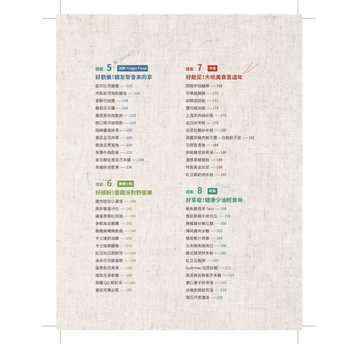 長年在美國波士頓生活的莎莎,從求學時期開始就自己做菜,下課或空閒時間經常相約到朋友家下廚,從食材採買、食譜研究到掌廚,全程不假他人之手。從一開始的生疏,至今已練就出神入化的巧手,隨時能就地取材、輕鬆端出嘗了一口就使人欲罷不能的好滋味,精湛廚藝讓人天天想去她家作客。而在國外生活久了的莎莎也發現西方有個熱愛辦派對的文化,無論是特殊節日或任何被大家認為值得慶賀的事都可以舉辦,比如喬遷派對、單身派對、寶寶迎新派對……。藉由派對上人與人之間的交流,不僅認識到許多志同道合的新朋友,也讓家人、朋友之間的情感更加緊密。