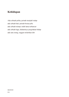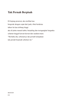 原詩的「戰火」與「螢火」押韻,譯詩是api kunang-kunang 與api perang 韻腳二重化、押得實在巧。「摯愛」與「傷害」化身為ada cinta sejati 與tiada perbuatan menyakiti,潛默的詞語複奏加上押韻,使詩的能量得以揮灑釋放,也讓我在讀了巫譯之後,進一步思考現代詩創新的其他可能。《現代詩秘笈》如果有一天會面世,翻譯家陳富興(潛默)居功厥偉。