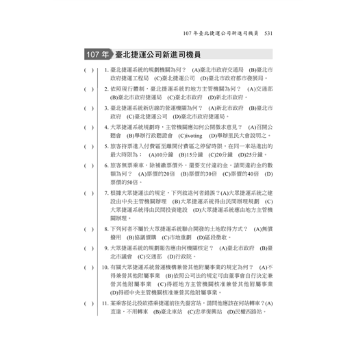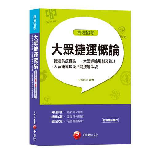 本書是為幫助讀者考上臺北捷運、桃園捷運、台中捷運、高雄捷運而編著,根作者根據多年從事運輸學與大眾捷運系統編撰的經驗及近年來「臺北捷運公司」及「桃園捷運公司」招考新進人員的考題,並參酌捷運相關教科書籍(如「軌道工程學」、「軌道運輸管理」等)及捷運單位相關資訊,精心整理編撰此考試專用書籍,讓考生能在有限時間內,獲致最佳效果。