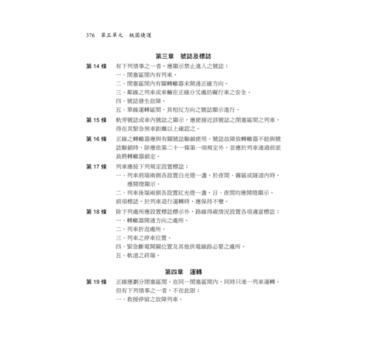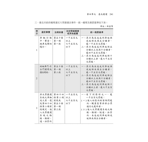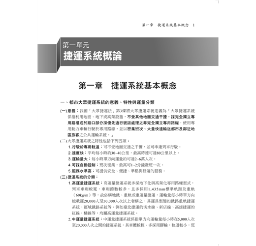 第一到第二單元介紹「捷運系統概論」、「大眾運輸規劃及管理」,此亦為各捷運公司命題的主要內容所在。第三單元介紹「大眾捷運法及相關捷運法規」,大眾捷運法為各捷運公司考試之出題頻率及百分比最高者,法規往往是讀者最難熟讀的部分,到底是要全部背起來,或是看過即可,因此作者特別針對有可能出題的相關法規,作重點式的整理速記。