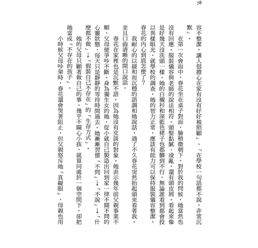 幾天後我和他的母親會面。她表示女兒小時候「乖巧、不任性,很好帶」。由於母親工作家庭兩頭燒,所有很少和女兒互動。奈奈的生活從國中開始脫序,導致自此以後母女兩人的關係變成只有責備。