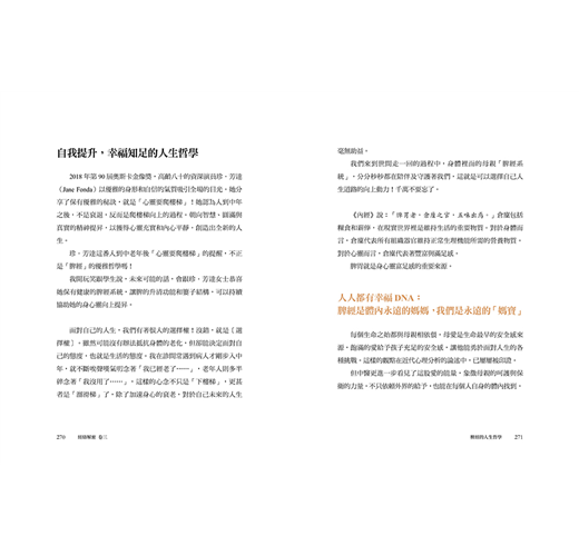 自我提升,幸福知足的人生哲學2018年第90屆奧斯卡金像獎,高齡八十的資深演員珍.芳達(JaneFonda)以優雅的身形和自信的氣質吸引全場的目光。她分享了保有優雅的秘訣,就是「心靈要爬樓梯」!她認為人到中年之後,不是衰退,反而是爬樓梯向上的過程。朝向智慧、圓滿與真實的精神提昇,以獲得心靈充實和內心平靜,創造出全新的人生。