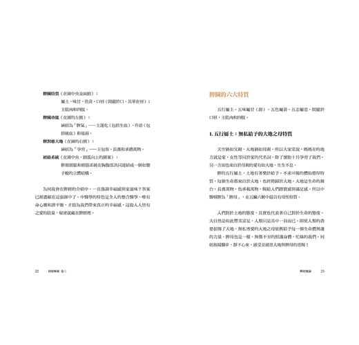 直到我試著把脾「屬土,味甘,色黃,開竅於口,其華在唇」這五個特質組合起來時,突然對脾母這形象有了不同的感受,這位豐腴的母親,就彷彿是我搭火車穿梭在台灣東部時,在池上、關山所見那一大片長滿黃澄澄稻浪的土地,映照在藍天綠水之間,讓人不自覺地升起一股幸福感。我們的母親不正如大地一般,毫不保留的給予我們源源不絕的愛,這才是脾的甜蜜家滋味呀!《經絡解密.卷三》單論一條經絡:脾經,雖然在《內經》中關於脾經經絡系統的循行介紹頗為簡要,但脾經在人體中所含藏的秘密與重要性,完全值得我們以一本專書來好好認識她。尤其了解脾經在人體體腔裡,就像一個簍子般向上托住重要的臟器,孕育守護著我們,再加上脾經更是下一條經絡「心經」愛的能量來源,這些都是讓我不得不感動的脾經力量。希望這本書也能讓每位讀者發現體內這位守護著我們不離不棄的母親。