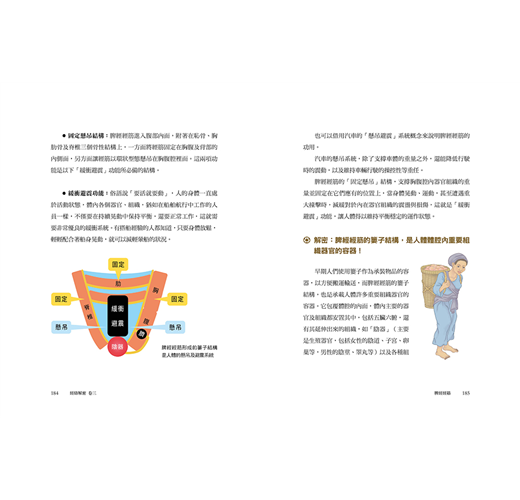 ●沈醫師長年研究經絡,結合臨床經驗,首度揭露脾經的人體「簍子」結構。將身體主要組織器官包覆且安置在脾經簍子裡,固定臟器,緩和衝擊,提供免疫防禦力,也深深影響女性一生的經帶胎產四件大事。