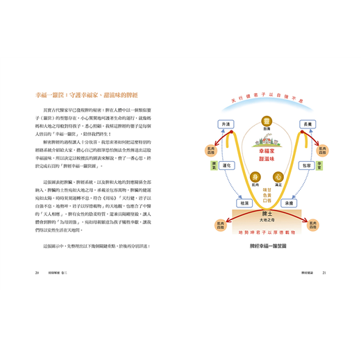 人人都有幸福DNA:脾經是體內永遠的媽媽,我們是永遠的「媽寶」每個生命之始都與母親相依偎,母愛是生命最早的安全感來源,飽滿的愛給予孩子充足的安全感,讓他能勇於面對人生的各種挑戰。這樣的觀點在近代心理分析的論述中,已屢屢被印證。但中醫更進一步看見了這股愛的能量,象徵母親的呵護與保衛的力量,不只依賴外界的給予,也能在每個人自身的體內找到,這就是脾經。在自己的身體裡面,脾經就是我們終生的母親。我們在脾經經絡系統中以大篇幅介紹了慈母線和遊子衣的重要性,脾氣是守護幸福的動力來源,脾氣維持脾的運化、升清,身體才能正常運作,而身心靈安頓,愛的能量飽滿才能擁有一籮筐的幸福!所以每個人身體裡與生俱來都具有幸福的DNA呀!有了脾母終生的照顧與陪伴,我們人人都是永遠的「媽寶」!脾經形成的簍子既是幸福籮筐,也是生命的安全網,對於情緒問題也能提供不錯的調節。我曾在《卷二》大腸經篇章介紹不少大腸癌病人的情緒垃圾滿了,無處可倒,造成身心疾病。若能善用心靈經絡概念,就可利用脾屬土的特質來幫忙,大地承載萬物,所以脾的簍子也能作為情緒垃圾的消化桶。加上五味中脾屬甘,甜味糖分也能刺激大腦製造血清素,讓我們放鬆快樂一點。這些都是可以善加運用的脾經功夫。