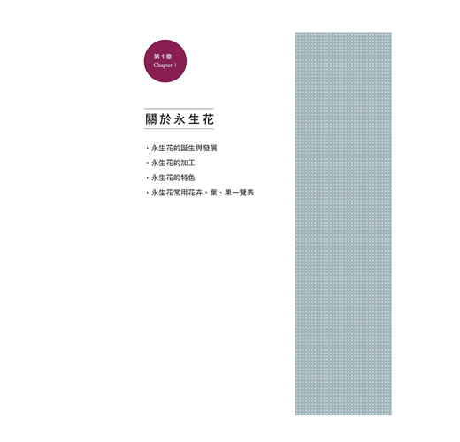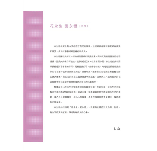 永生花的花語是「花永生,愛永恆」,我願藉此書把對大自然、對花、對生活的愛和感謝,傳達到每個人的心中。