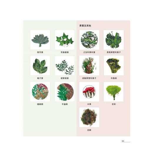 ①樹葉標本三種;②深粉色中號玫瑰;③淺粉色中號玫瑰;④淺粉色迷你玫瑰;⑤白色馬蹄蓮