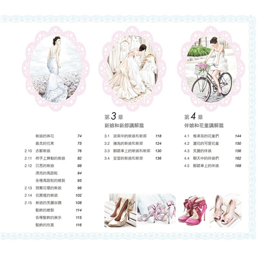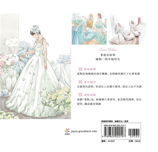 本書是色鉛筆繪製婚紗的技法大全。全書共分四章,第一章從色鉛筆的基礎開始說明,以婚紗質感、花邊和皺褶的表現來講解色鉛筆的基本技巧;第二章透過練習繪製穿著各式婚紗的新娘,重點講解婚紗的線稿繪製和上色過程,同時穿插與婚紗搭配的髮飾髮型、新娘捧花、高跟鞋的繪製方式,全面而具體地展示色鉛筆婚紗畫作...