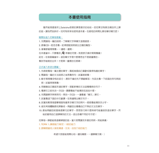 念完本書除了可以應付韓國當地旅遊的簡易狀況之外,如果想繼續學習者,也能完美銜接目前韓語教育最多老師使用的首爾大學韓國語系列(本書念完可接1B)。