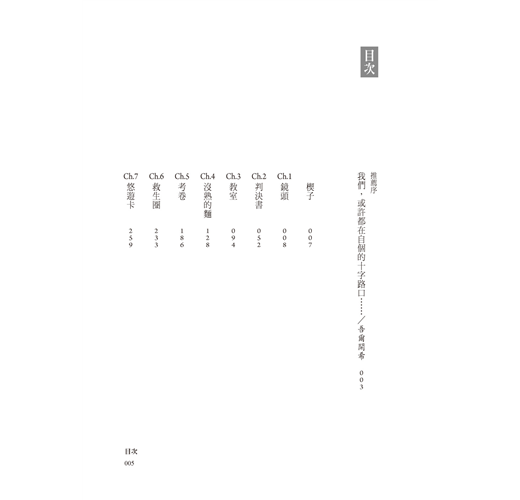 每一章節的人物心境與微小互動,就如同一片片拼圖,讓讀者漸漸拼湊出最終事件的全貌,同時也從這些碎片中若隱若顯的鏡像,映照出自身與事件之間的關係。