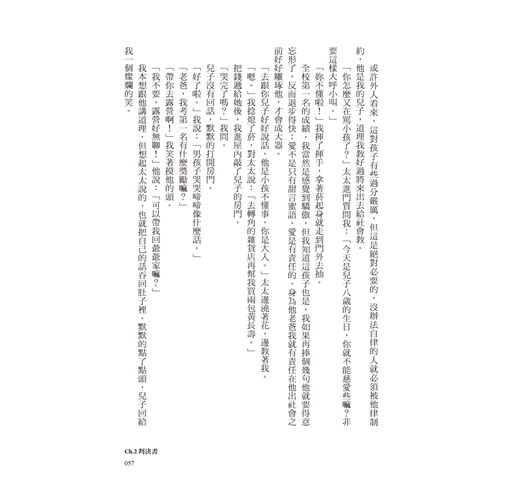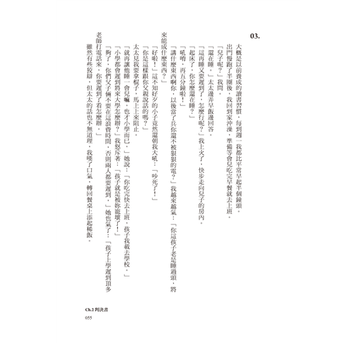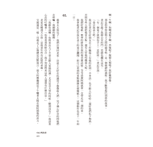 每一個章節都有一個主角,都是用章節主角的雙眼去看著事件的發生經過,一件事從兩個不同的角色看來,就有兩種不同的觀點――未必能讓讀者認同...