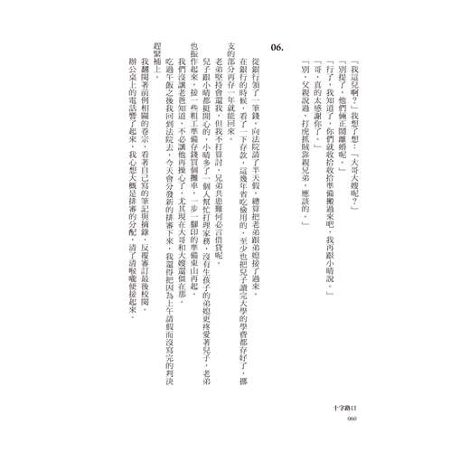 這是一本反省之作,身處社會,我每個人都必須自我省思,自己與重大刑案、社會事件的關連。新聞報導給予我們的,往往只有片面,義哲在《十字路口》中也嘗試以不同過往描述重大災難的敘述,寫著事件中每個關係人在事件前的生命脈絡,而不是去談每個人在共同的劫難後有什麼樣的心境與人生――我想這也是他在書寫時希望重新提醒社會的,「在悲劇裡的每一個人,其實都是有血有肉,都有他們的人生,不應該只被以災難來標籤、記得」。