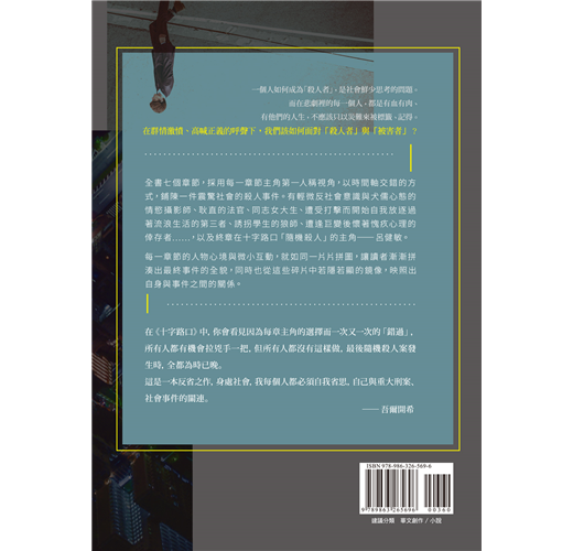 全書七個章節,採用每一章節主角第一人稱視角,以時間軸交錯的方式,鋪陳一件震驚社會的殺人事件。有輕微反社會意識與犬儒心態的情慾攝影師、耿直的法官、同志女大生、遭受打擊而開始自我放逐過著流浪生活的第三者、誘拐學生的狼師、遭逢巨變後懷著愧疚心理的倖存者……,以及終章在十字路口「隨機殺人」的主角──呂健敏。