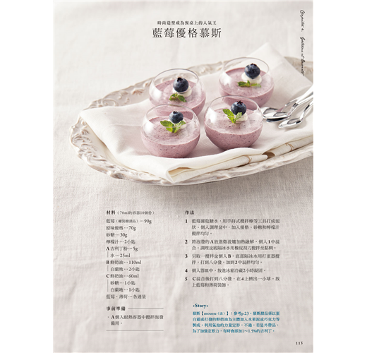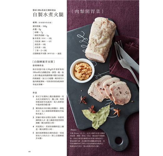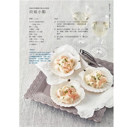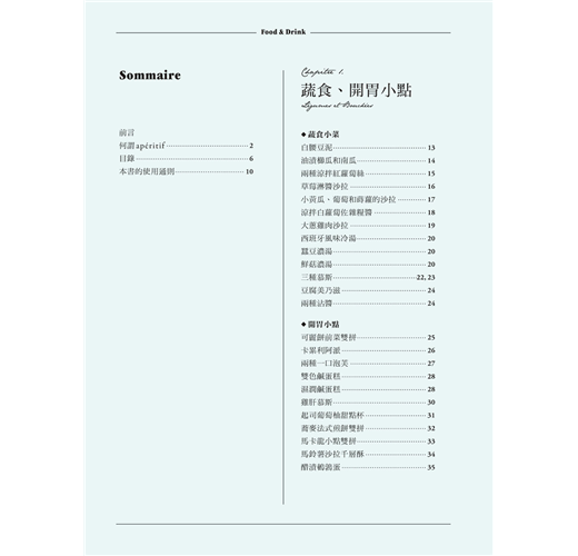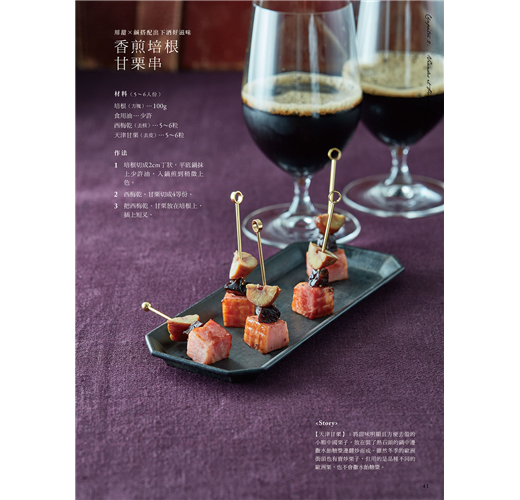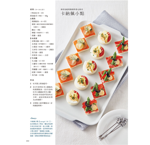 從廣泛運用各式食材的開胃菜,一直到小巧華麗的甜點,本書為您介紹多道餐前酒派對中必備的小點食譜。不只如此,每道食譜皆有解說其起源或來由,在製作料理的同時,還能品味背後有趣的小故事。當中收錄的酒款及起司百科,更記載了豐富的相關歷史與知識,在搭配、挑選食材方面,想必能有所助益。